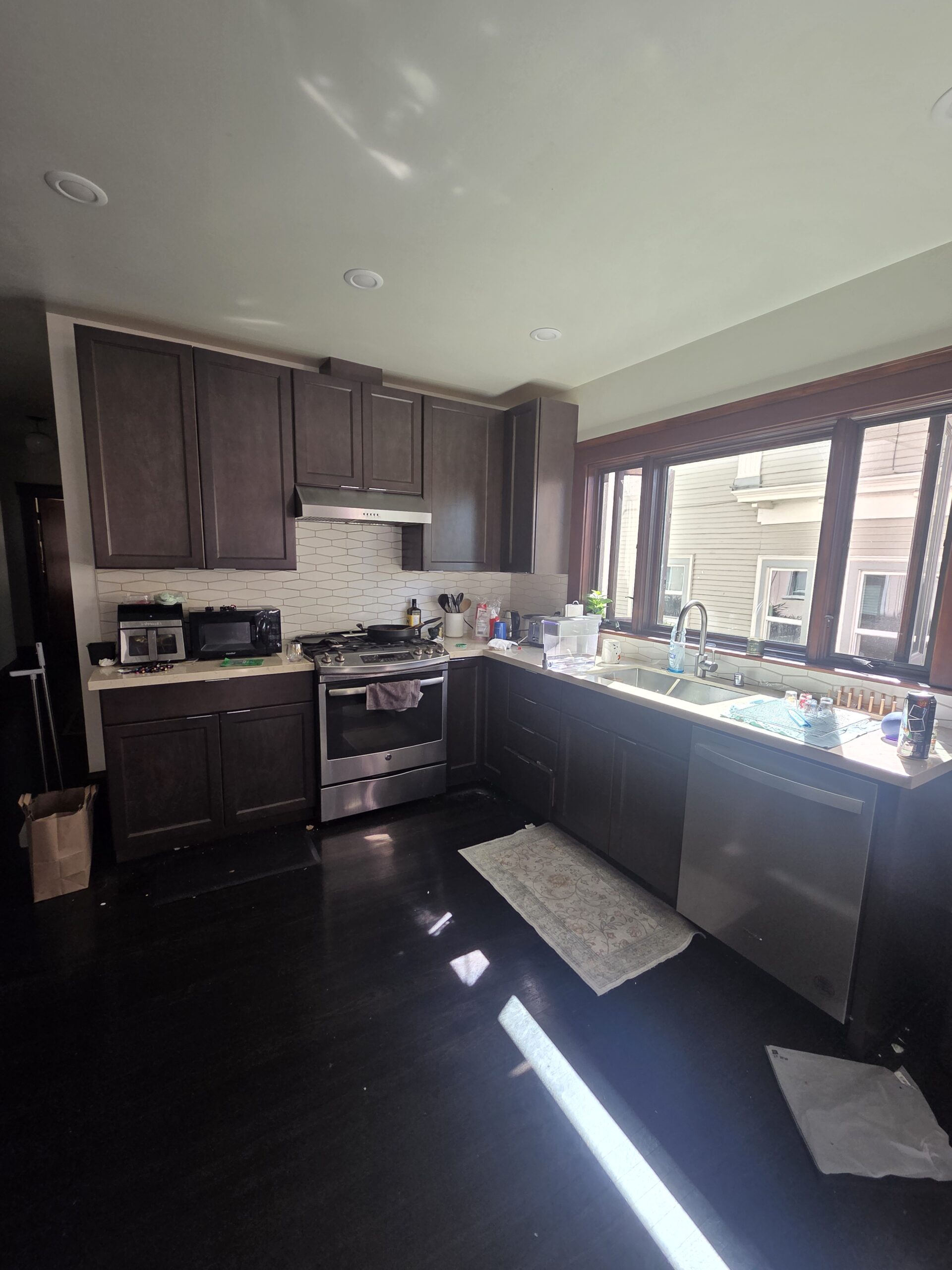 Kitchen has stainless steel appliances, stove, fridge, dishwasher.